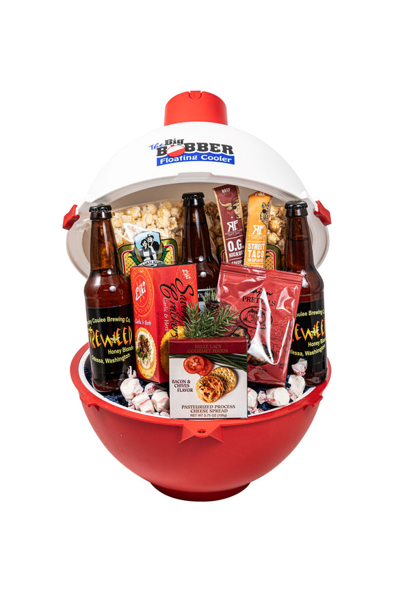 It doesn't get much cooler than this! This larger than life sized bobber is a floating cooler filled with a variety of Northwest brewed beers, gourmet popcorn, savory beef sticks, cheese, crackers and more.