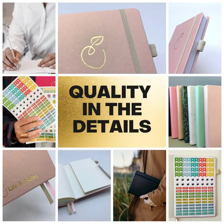 Product details: * Size 5.5"x 8.2" (A5), vegan hardcover * Covers 13 weeks, 90 days * Lays flat * 100gsm thick paper * Pen holder, closure band, 2 ribbon bookmarks and an inner pocket for notes. * Planner stickers sheet
