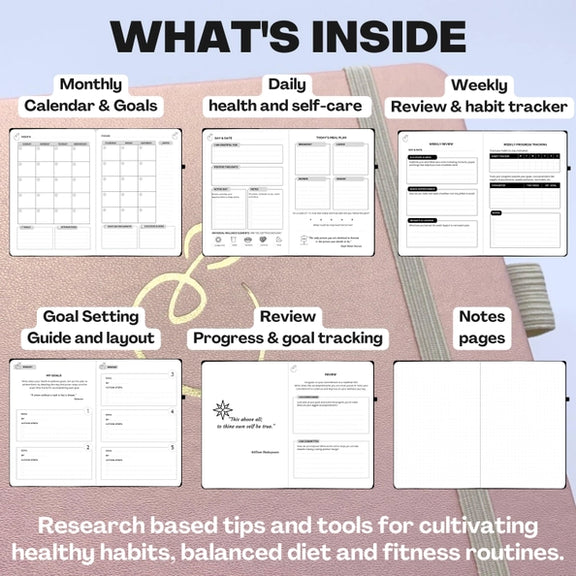 Content includes: * Goal setting * Gratitude * Affirmations * Food journal / Meal planner * Fitness planner * Habit tracker * Goal progress tracking * Inspirational quotes