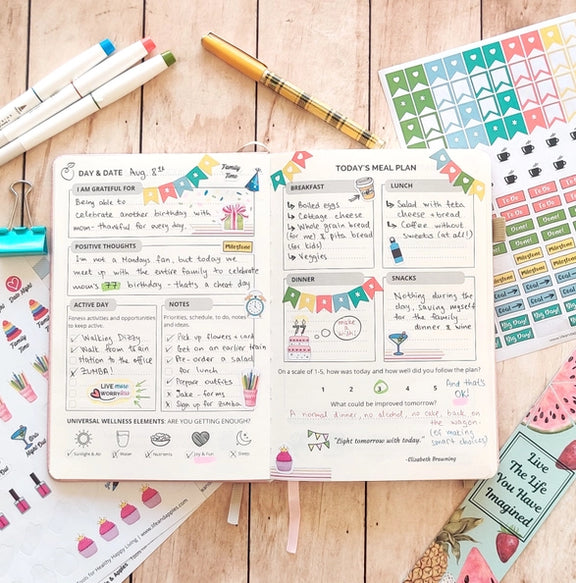 A daily wellness planner for healthy living, body and mind Achieve health, diet and fitness goals with a planner that provides a holistic approach to wellness. Includes tools to log food consumption, plan meals and fitness activities, develop positive habits, record self-care habits, track goal progress and cultivate joy.