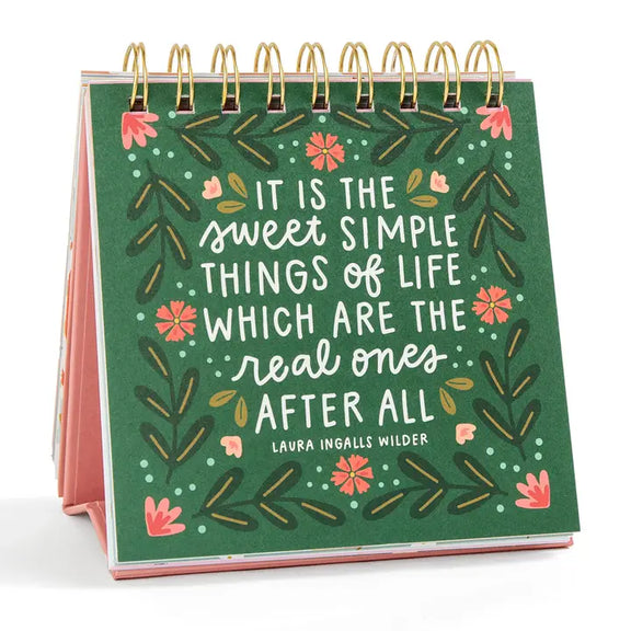 Stay inspired all year round with our 52 Weeks of Happy Quotes Desk Flip Calendar! Featuring hand-lettered and illustrated motivations for each week, this undated calendar is a daily dose of positivity. From 'Be the One Who Makes Others Feel Included' to 'Kindness Goes a Long Way' and 'Every Day Is A Fresh Start,' it's perfect for teachers, your desk at the office, or a family common area. Whether you need a boost at work or a reminder to spread kindness throughout your day, this calendar has you covered. Get ready to flip your way to a happier year! • Features: 52 weekly designs; gold-foiled cover, perforated pages, spiral bound, free standing easel design • Size: 5" x 5.5"