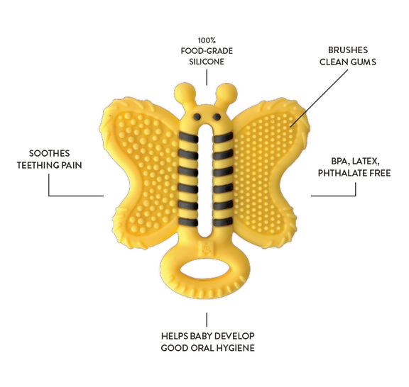 Tailor-made for baby's first teeth, this unique teether-brush provides sensory satisfaction to baby's sensitive gums, lips and tongue. Perfectly sized for baby's smaller hands, the handle was carefully created as a teething ring for additional teething and cleaning satisfaction.