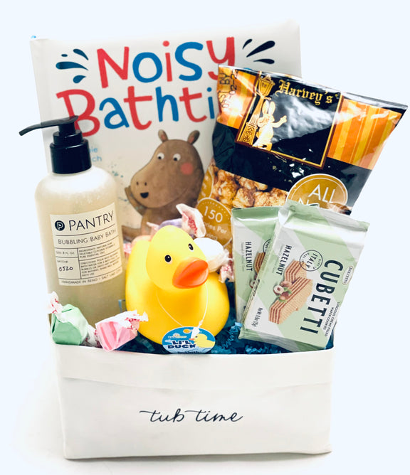 Send the happy new parents our Bath Time themed gift basket. Goodies for the new baby and yummy treats for Mom and Dad too!