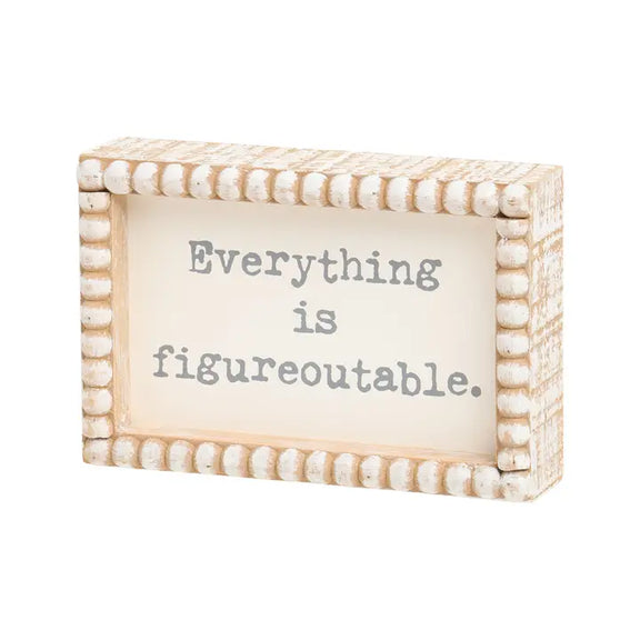 - "Everything is figureoutable" weathered wood box sign with beaded edge and white background with gray text.