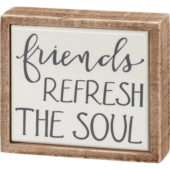 A wooden box sign mini featuring a hand lettered "Friends Refresh The Soul" sentiment and faux enamel finish for tile-like appearance. Easy to hang or can free-stand alone.