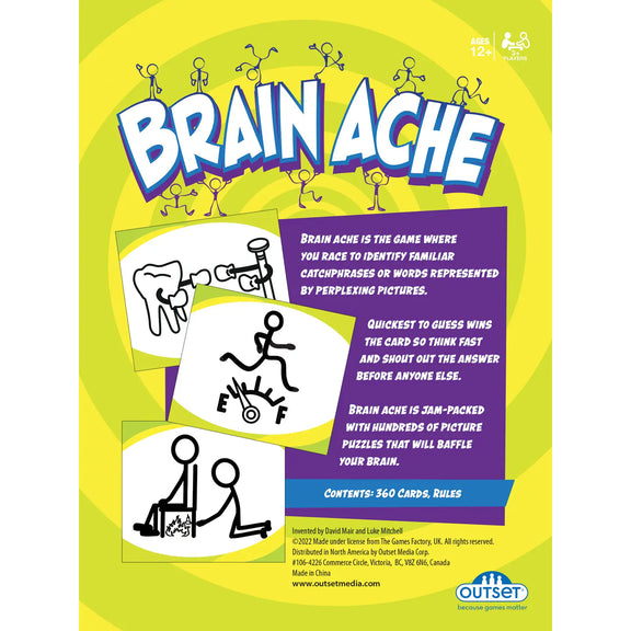 Brain Ache is the ultimate puzzling picture game that will challenge the whole family! In this fast-paced game, players race to identify familiar catchphrases, words, or sayings, all depicted through quirky and sometimes perplexing drawings. The faster you guess, the more cards you win—but be careful, because the images can be tricky! The first player to collect 10 cards becomes the ultimate Brain Ache champion! With 360 cards filled with creative and hilarious illustrations, this game is packed with endless fun for everyone. Whether you're playing with family or friends, it's a game that keeps everyone on their toes. Age Range: 12+ Players: 3+ Cards: 360