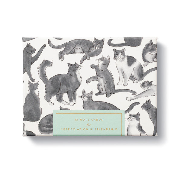 Express your heartfelt gratitude to the cat lovers in your life. Featuring charming illustrations and sincere messages, these note cards are sure to create smile-worthy moments. The set includes 3 each of 4 designs with envelopes and foil accents throughout.
