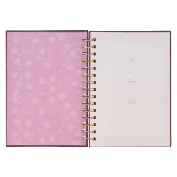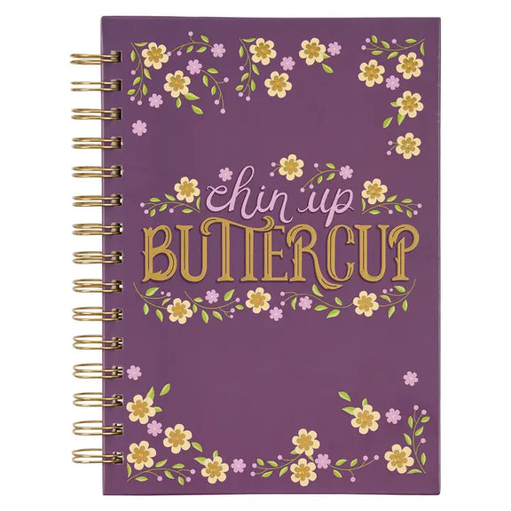 The Chin Up Buttercup Wirebound Journal is the perfect way to work through life's ups and downs, to get your mind straight and your chin up. A deep dark purple color surrounds the front and back of this wirebound journal. Tiny yellow and gold flowers interspersed with green leaves and purple blossoms frame the purple and gold embossed sentiment.