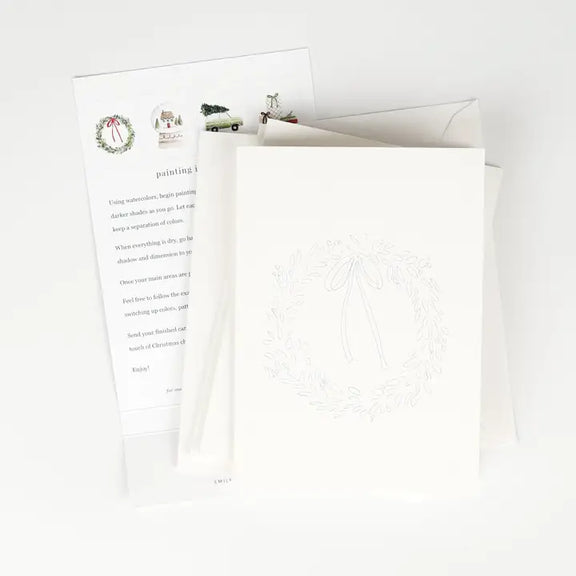 Paint your own special Christmas cards to send to loved ones this year! Sketches are printed on the front of each card with simple instructions for you to paint in with watercolors. You'll receive eight cards with two of each illustration: wreath, snowglobe, gifts, Christmas tree truck. Perfect for artists of all ages!