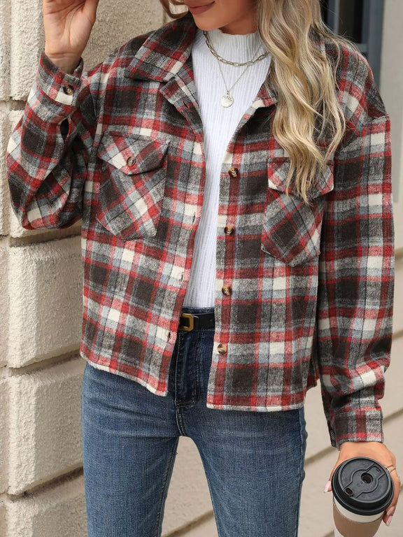 Cozy meets casual in this stylish plaid shacket (shirt + jacket). Featuring a classic red, white, and charcoal checkered pattern, this soft button-up adds the perfect layer of warmth for chilly days. Designed with front flap pockets, a relaxed fit, and a slightly cropped cut, it pairs effortlessly with jeans and boots for a laid-back, timeless look.