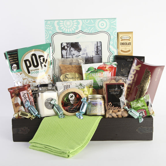 This gorgeous and elite gift basket makes the perfect housewarming gift! Our beautiful reusable wooden tray comes filled with goodies they are sure to love and to help them decorate their new home. Nestled inside you will find a decorative picture frame, fragrant candle, a dishtowel to match the current season, smoked salmon, cheese, crackers, gourmet popcorn, our famous soft peanut brittle, nut and snack mixes, decadent chocolates and cookies, and more!