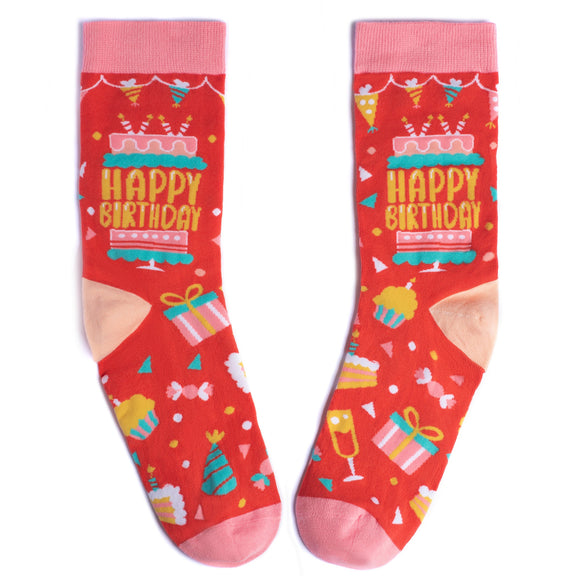 Walk into a birthday bash with our fun birthday cake socks! Celebrate in style with a cute birthday pattern featuring cake, presents, and a big birthday cake graphic with "Happy Birthday" written on the side of each leg.