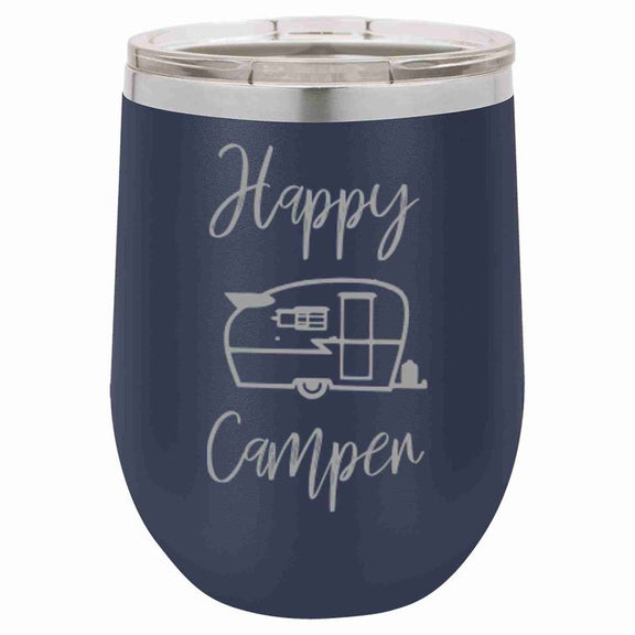 Engraved 12 oz wine tumbler with a durable powder coated color. All tumblers are engraved to insure the writing will never peal or fade. This tumbler comes with the phrase "Happy Camper"