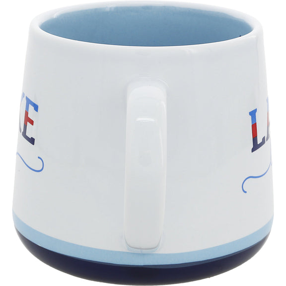 - DESIGN: The coffee cup features a triple-tone white, light blue, and dark blue striped pattern and a "Lake Life" tri-colored light blue, dark blue, and red sentiment on both sides of the mug. Additionally, the interior is blue with a large anchor on the side wall.
