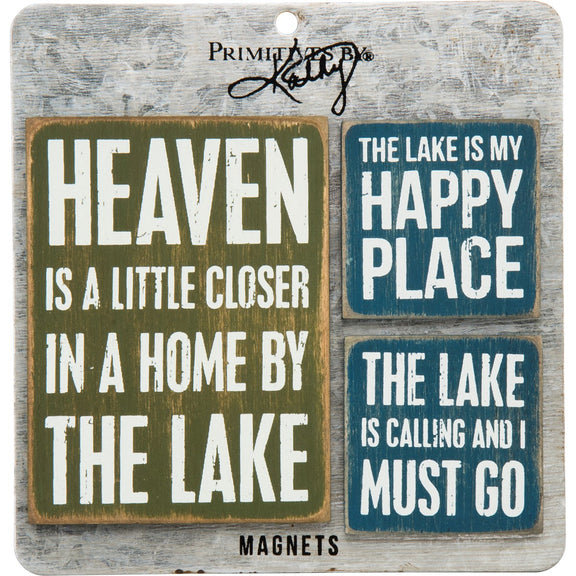 A set of three wooden magnets featuring distressed "Heaven Is A Little Closer In A Home By The Lake," "The Lake Is My Happy Place," and "The Lake Is Calling And I Must Go" sentiments in a nature-inspired palette.