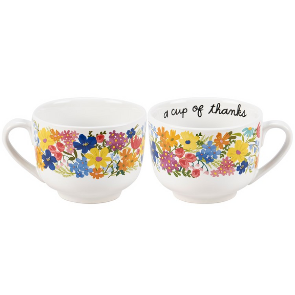 A stoneware 20 oz mug displaying a full wrap-around design of vibrant hand illustrated florals. Mug also features an inside design with inspirational sentiment along the rim that reads "A Cup Of Thanks" and flowers at the bottom. Our A Cup Of Thanks mug is microwave, oven, dishwasher, and food safe for easy use. An inspirational gift perfect for everyday drinkware.