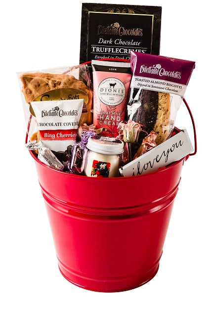 Send extra sweetness with this thoughtful gift basket filled with gourmet chocolate truffles, our famous soft peanut brittle, Goat Milk hand cream, mini scented candle, mini Valentine's Day sign and other yummy treats!