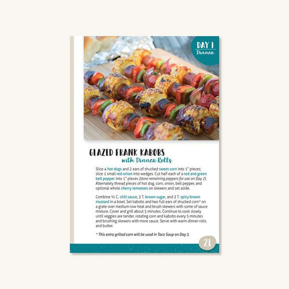 You’ll get complete menus for five different 3-day trips, including breakfast, lunch, and dinner each day (plus a few snacks and desserts of course). Each recipe serves four people and can be cooked over the campfire or inside your camper. You can start your day with Rise ‘n’ Shine Kabobs, break for lunch with Stuffed Mexi-Burgers, and enjoy a relaxing dinner with Cajun Shrimp Pot.