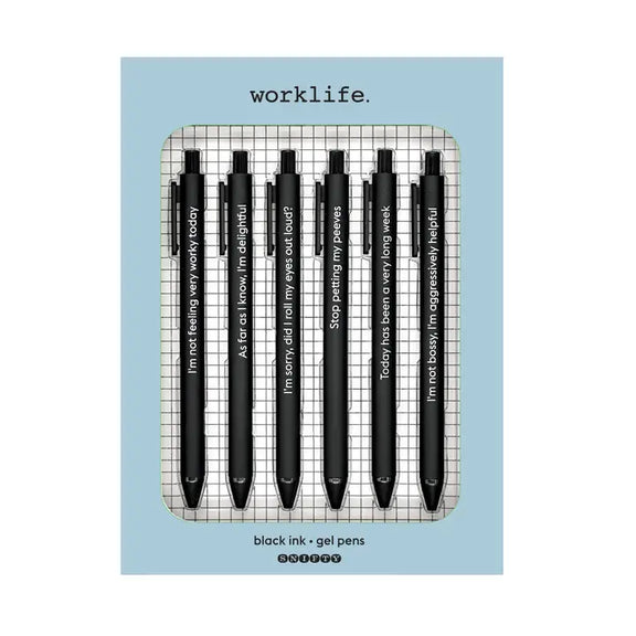 These beautifully packaged QUOTABLE gel pens have witty sayings, soft touch barrels and black gel ink. Set of 6 pens Box - 6" x 8"