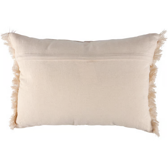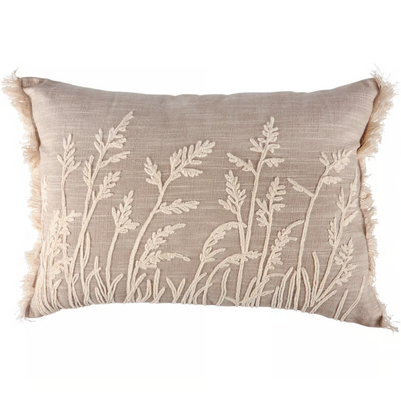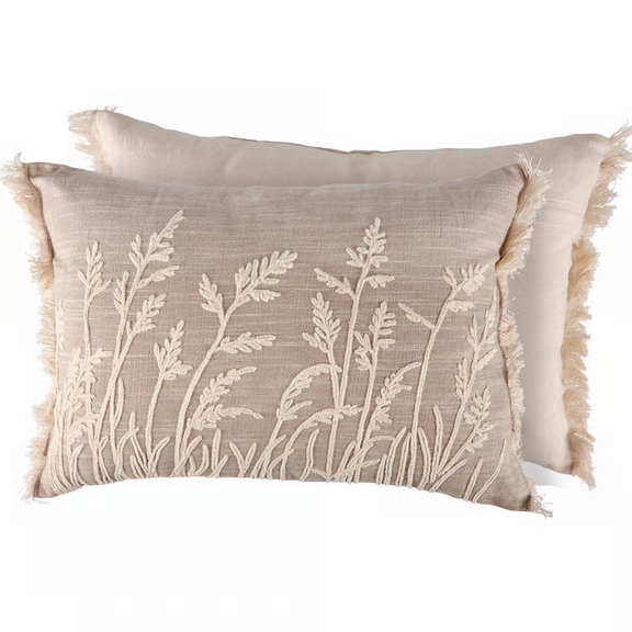A decorative cream cotton pillow displaying natural grass designs embroidered for added textures with fringe sides for a freeform style. Pillow features a zipper to easily remove and clean cover. Our Natural Grasses pillow contains polyester filling. A rustic everyday home accent that coordinates with a variety of décor.