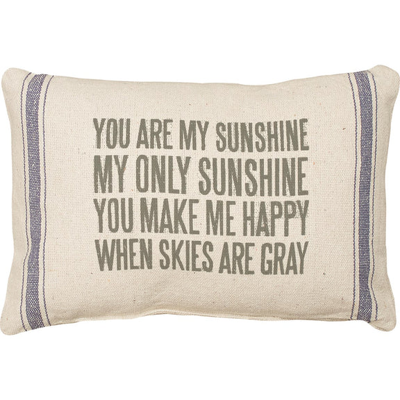A cotton and polyester pillow featuring a distressed "You Are My Sunshine - My Only Sunshine - You Make Me Happy - When Skies Are Gray" sentiment with striped trim designs. Complements well with coordinating pieces in collection or existing decor. Includes a zipper to easily remove and clean cover. Shipped vacuum sealed for protection and storage.