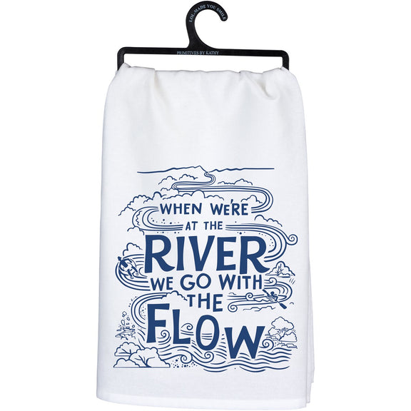 A white cotton kitchen towel displaying a unique hand illustrated design of a river with a fun outdoor-themed sentiment that reads "When We're At The River We Go With The Flow." Design features an outdoor inspired blue color. Our With The Flow kitchen towel is machine-washable for convenient cleaning.