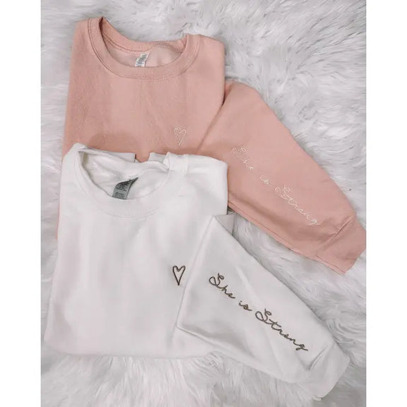 Embroidered Sleeve 'She is Strong' Sweatshirt in Blush Pink or White Style: Crewneck Color: Dusty Pink or White Sizing: Unisex (see size guide in photos for reference) Material: 50/50 cotton/polyester Embroidery: She is Strong + a mini heart outline Thread Color: White thread with Blush Pink Sweatshirt or Beige thread with White Sweatshirt Placement: 'She is Strong' is along the left sleeve, and the mini heart is left of the chest.