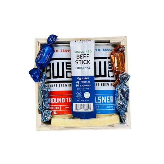 Perfectly sized to convey warm wishes. This reusable container comes complete with cheese, a savory meat stick, chocolate truffles, and 2 cans of Northwest brewed beer.