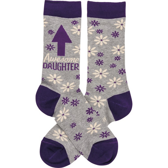 These colorful socks feature woven designs with coordinating "Awesome Daughter" sentiment. Cotton, nylon, spandex. These awesome daughter socks are one size fits most.