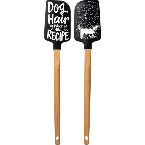 A silicone spatula with a wooden handle. Features sentiment on front and complementing designs on back. Handles feature laser cut logos and drilled hole with ribbon loop for easy hanging. Heat resistant up to 375 degrees Fahrenheit. Hand-wash recommended. Not microwave safe.