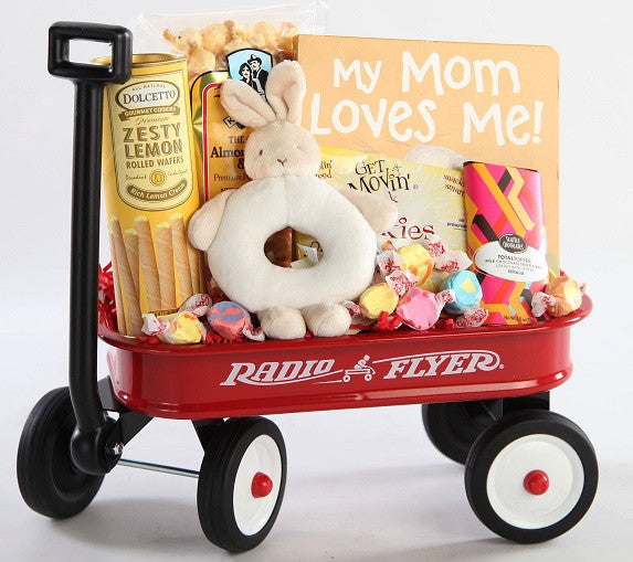 This delightful red wagon always delivers bundles of joy to new parents. We've taken the famous Radio Flyer wagon and filled it with things for the new baby and treats for the new parents too. A pink or blue plush toy is combined with a book for the new baby, gourmet popcorn, and other assorted goodies and keepsakes. We'll even imprint "It's a girl" or "It's a boy" on the ribbon!