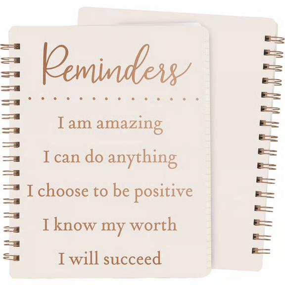 A double-sided spiral notebook featuring a metallic foil "Reminders I Am Amazing I Can Do Anything I Choose To Be Positive I Know My Worth I Will Succeed" sentiment on a neutral palette. Our Reminders spiral notebook contains 120 lined pages.