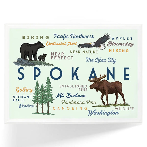 Spokane magnet featuring exclusive artwork on quality materials in vibrant full color. Using eco-friendly ink, FSC certified paper, recycled materials, sourced responsibly and planet friendly. Made in USA, supporting domestic production.