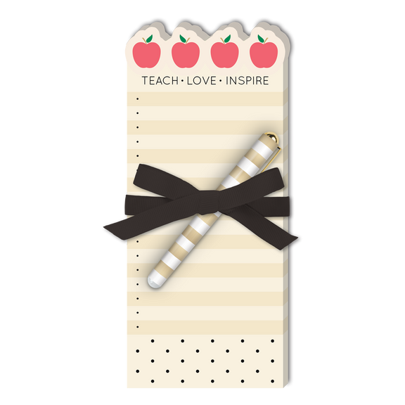 Keep tasks and lists in sight and top of mind on this shaped notepad. Featuring, inspiring words, cute apple and polka dot design with coordinating pen wrapped with a hand tied ribbon.