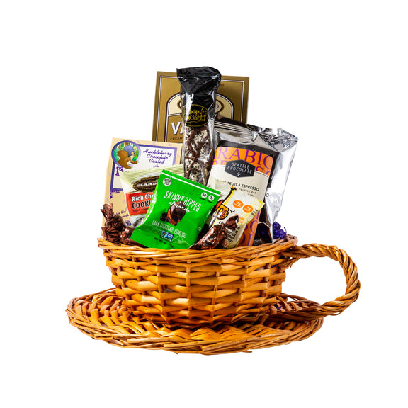 A Coffee Lovers dream gift! This fun coffee themed gift basket is built inside our willow coffee cup and saucer basket and is the perfect gift to show your appreciation. Each basket comes filled with a packet of local coffee, a delicious biscotti, coffee flavored chocolate truffles, and much more! Pick our $65 selection to have us add a $10 gift card to a coffee shop. (local coffee shop if basket is being delivered here in the Spokane area and a Starbucks gift card if basket is being sent outside of the Spokane area.)