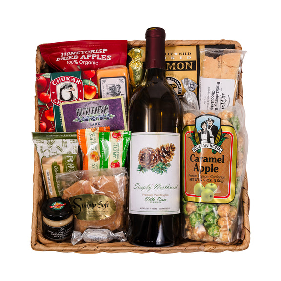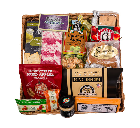 Celebrate the season with a gift that’s proudly Northwest! Our Holiday Washington Favorites basket is filled with locally made specialties, including caramel apple popcorn, artisan crackers and cheese, and rich smoked salmon. Sweet additions like Honeycrisp dried apple crisps, chocolate-covered cherries, Aplets & Cotlets fruit and nut candies, huckleberry bark, and our Famous Soft Peanut Brittle bring the flavors of Washington to life. Rounded out with savory Walla Walla Sweet Onion mustard and other gourmet treats, this basket is the perfect way to share holiday cheer and a true taste of Washington.