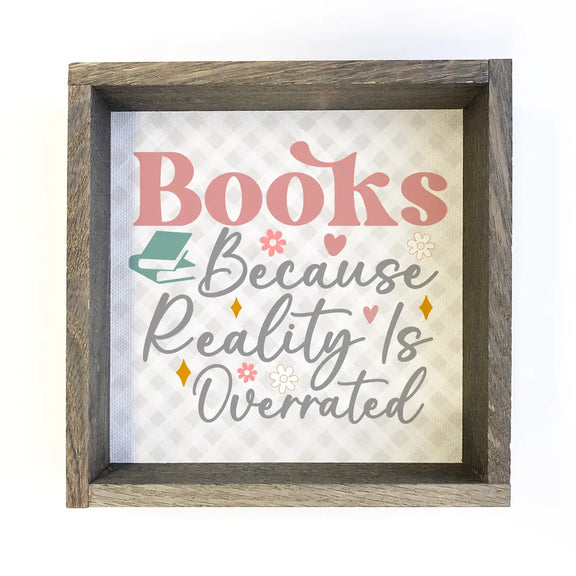 Adorable and fun art print word sign that proudly declares "Books. Because reality is overrated." Accentuated with daisies, diamonds, hearts, and a charming stack of teal books. Perfect for your bedroom, as it serves as a gentle reminder of the enchanting worlds waiting to be explored within the pages of a good book.